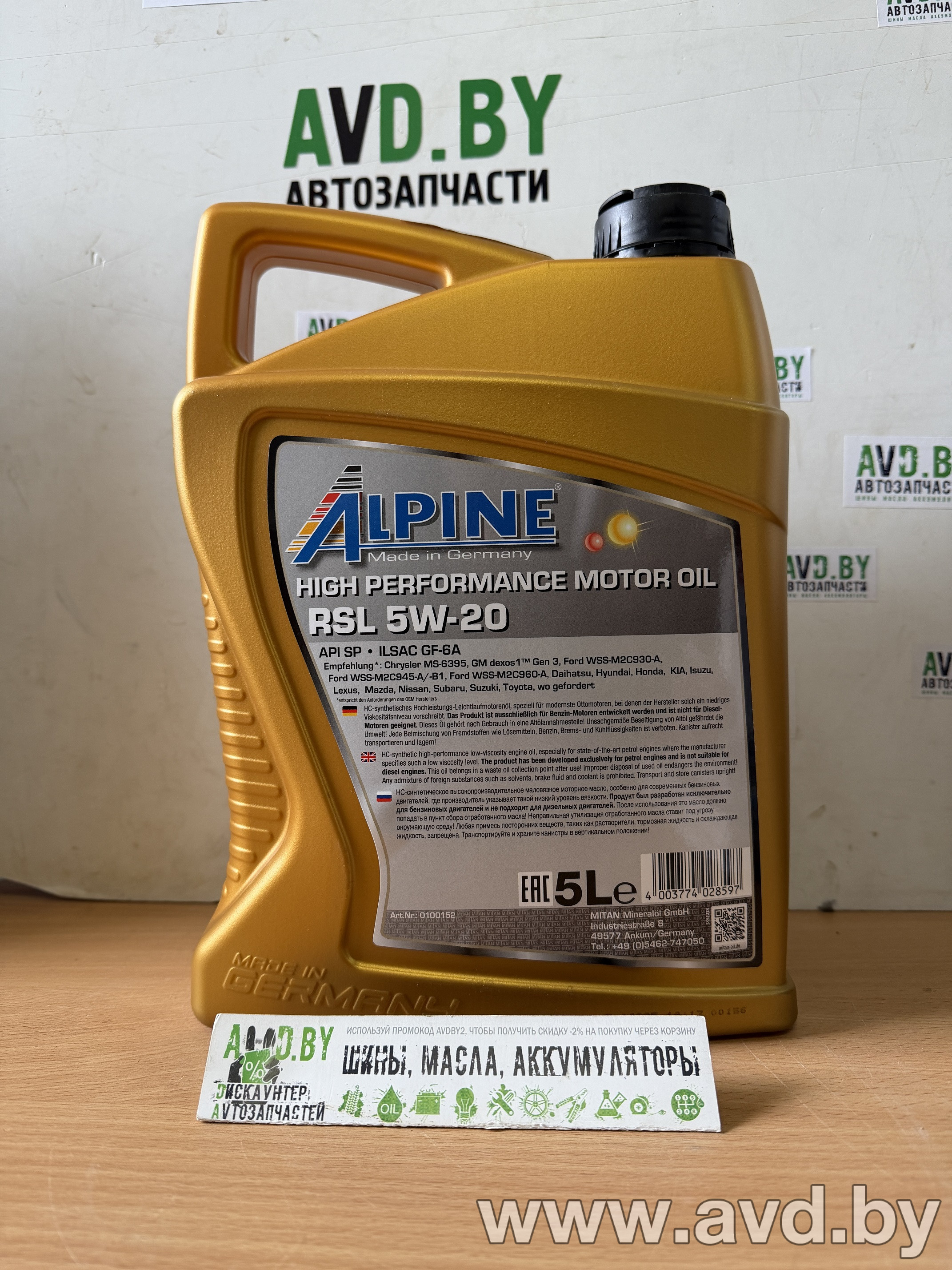 Дискаунтер автозапчастей AVD.BY реализует по оптимальным ценам моторные масла ведущих иностранных производителей. Богатый ассортимент масел различных объемов и допусков позволяет подобрать моторное масло для Вашего авто. Моторное масло Alpine RSL 5W-20 5л и другие товары можно заказать с доставкой в любой город Беларуси, получив гарантию и скидки на следующие покупки!